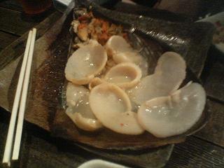飲み会の二次会で会社の上司に連れて行ってもらいました。 お昼は営業していないので初めて行きました。 店内は独特な雰囲気です。 カウンター、テーブル席を含めて10人ちょっとぐらいしか入れなそうです。 店内の壁には落書き?のような書き込みで覆われています。 ビールは紙コップに入っていて、お皿は紙パックです。 食器代はかなり安そうです。 おまかせセット:★★★★☆ うまい!かなりうまかった(゜∀゜)(゜∀゜) 貝は焼きたてでアツアツでうまいです。 いろいろな貝が出てきました。 貝の種類は、 はまぐり、白貝、さざえ、大アサリ、マテ貝、あげ巻貝、亀の手、白ミル、北寄(ほっき)、 帆立、生トリ貝、平貝、ムール貝、あわび とかがあるようです。 2次会にはオススメですが、 お店が狭いので電話をしてから行った方がいいでしょう。 東京都中央区新富1-17-6 http://newrich.fc2web.com/frame.html |